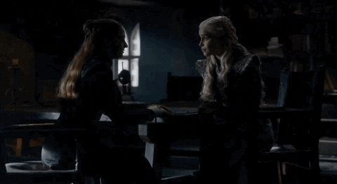 La conversación se vuelve más tensa, porque la idea de Sansa es que Invernalia sea libre, no quiere estar bajo el gobierno de nadie. Como es de esperar la idea no le parecerá nada bien a Daenerys, que separa la mano que tenía apoyada en Sansa y cuando le va a responder, interrumpen la conversación.